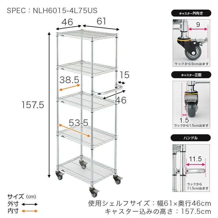 他の画像を見る NEW 交換保証対象品 送料無料 ワゴンラック 幅60cm 4段 スチールラック カートワゴン ルミナスレギュラー 幅61×奥行46×高さ157.5cm NLH6015-4L75US 【予約商品】12月下旬入荷 ¥ 20,800 税込 カートに入れる