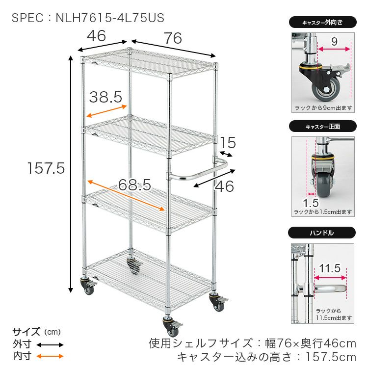 他の画像を見る NEW 交換保証対象品 送料無料 ワゴンラック 幅75cm 4段 スチールラック カートワゴン ルミナスレギュラー 幅76×奥行46×高さ157.5cm NLH7615-4L75US 【予約商品】12月下旬入荷 ¥ 21,800 税込 カートに入れる
