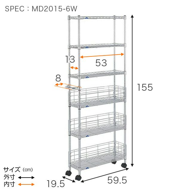 シェルフ、ポール、ハンドル、サポート柵(大、小):スチール(クロームメッキ) スリーブ:ABS樹脂 キャスター:ナイロン樹脂 |