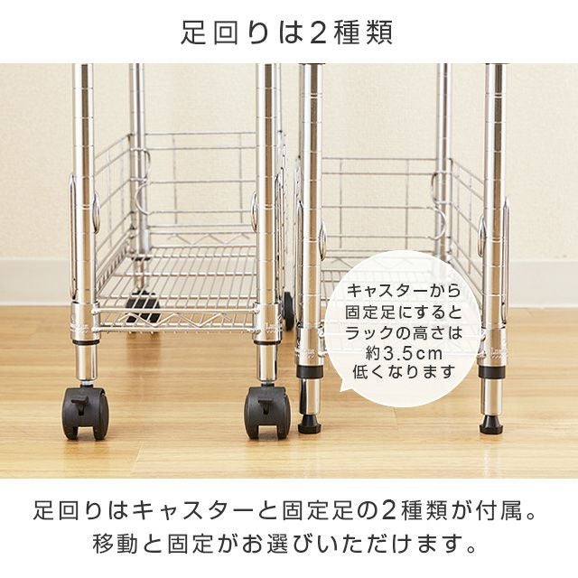 シェルフ、ポール、ハンドル、サポート柵(大、小):スチール(クロームメッキ) スリーブ:ABS樹脂 キャスター:ナイロン樹脂 |