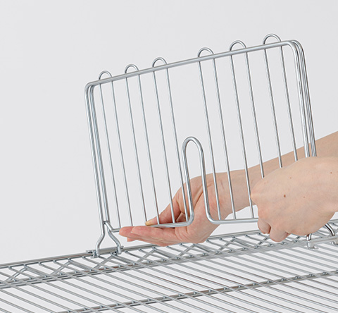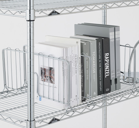 ディバイダはブックエンドのようなストッパーの役割を果たし、スペースを区切り、シェルフに載せた荷物を支えることで、日々の整理収納をスムースにします