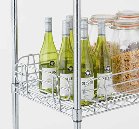 収容物の落下が心配なスチールラックですが、側面をサポート柵でガードすれば、陶器などのワレモノや重い物、形状が不安定なもの落下防止に役立ちます