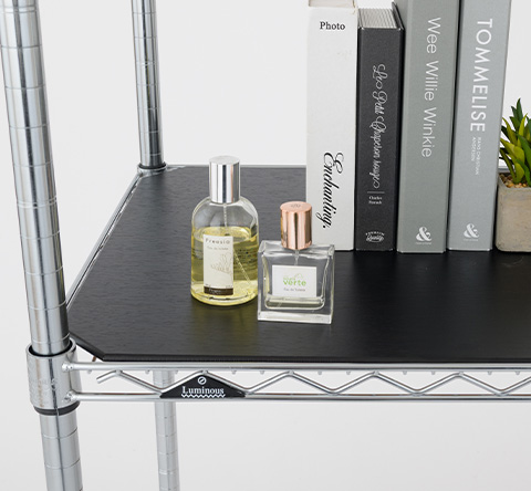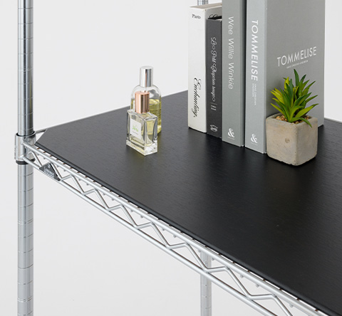 光を通すクリアカラーが軽やかで、スチールラックらしい見た目の開放感を残しつつ用途の幅を増やせます