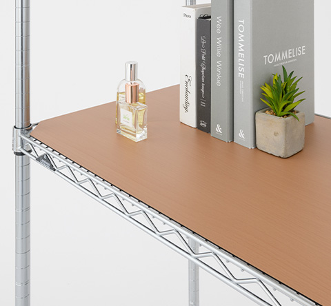 シェルフに専用シートを敷くことで、小さな雑貨やディスプレイ小物、脚付きの家電製品などを安定させたり、シェルフ全体の佇まいを変えることができます