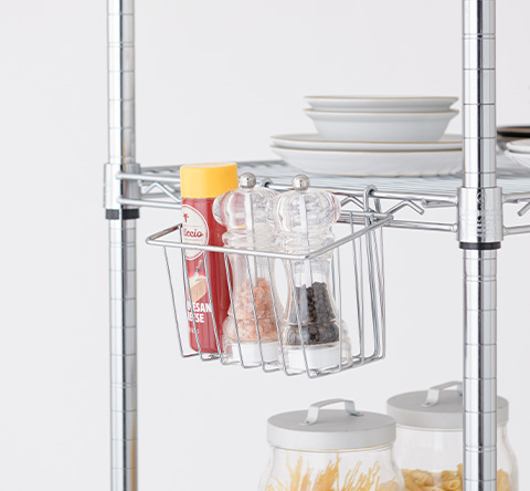 簡単に付け外しができるバスケットは、日常のこまごましたアイテムの取りまとめにピッタリ。