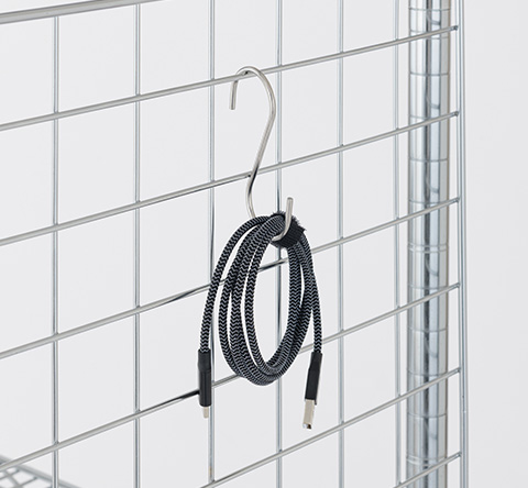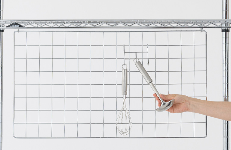 ワイヤーバーは、ラックの安定を高めるパーツでもあり、ポール(支柱)2本に取り付け可能です。フックが掛けられるため、空いたスペースを有効活用したいときに、ぜひご活用ください。