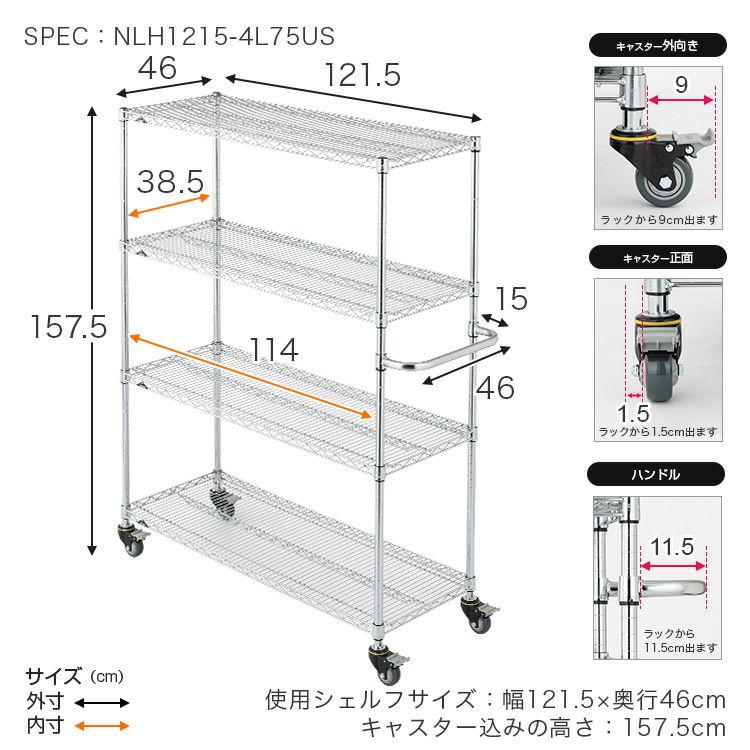 他の画像を見る NEW 交換保証対象品 送料無料 【予約商品】12月下旬入荷 ワゴンラック 幅120cm 4段 スチールラック カートワゴン ルミナスレギュラー 幅121.5×奥行46×高さ157.5cm NLH1215-4L75US ¥ 23,800 税込 カートに入れる