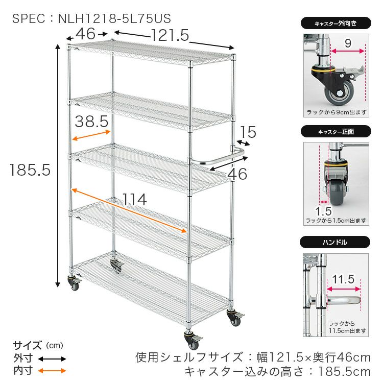 他の画像を見る NEW 交換保証対象品 送料無料 【予約商品】12月下旬入荷 ワゴンラック 幅120cm 5段 スチールラック カートワゴン ルミナスレギュラー 幅121.5×奥行46×高さ185.5cm NLH1218-5L75US ¥ 25,800 税込 カートに入れる