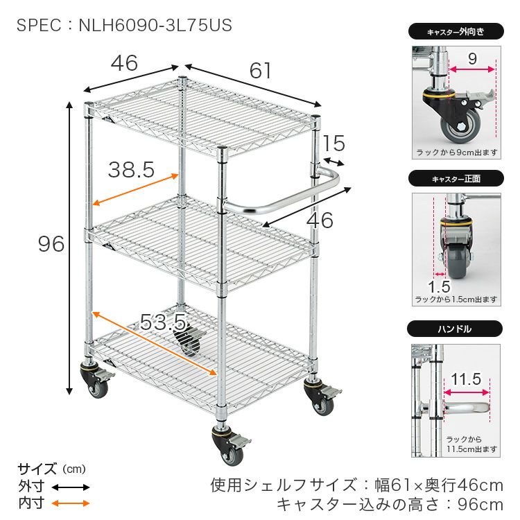 他の画像を見る NEW 交換保証対象品 送料無料 【予約商品】12月上旬入荷 ワゴンラック 幅75cm 3段 スチールラック カートワゴン ルミナスレギュラー 幅76×奥行46×高さ96cm NLH7690-3L75US ¥ 19,800 税込 カートに入れる