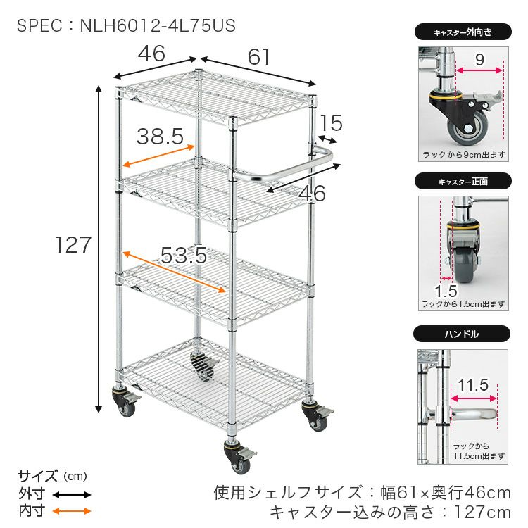 他の画像を見る NEW 交換保証対象品 送料無料 【予約商品】12月下旬入荷 ワゴンラック 幅60cm 4段 スチールラック カートワゴン ルミナスレギュラー 幅61×奥行46×高さ127cm NLH6012-4L75US ¥ 19,800 税込 カートに入れる