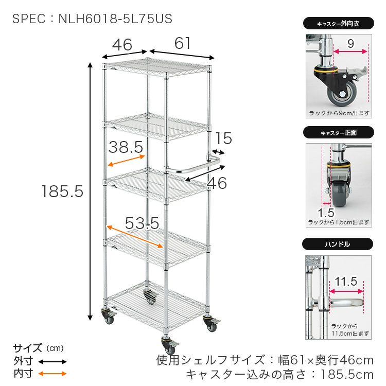 他の画像を見る NEW 交換保証対象品 送料無料 【予約商品】12月下旬入荷 ワゴンラック 幅60cm 5段 スチールラック カートワゴン ルミナスレギュラー 幅61×奥行46×高さ185.5cm NLH6018-5L75US ¥ 22,800 税込 カートに入れる